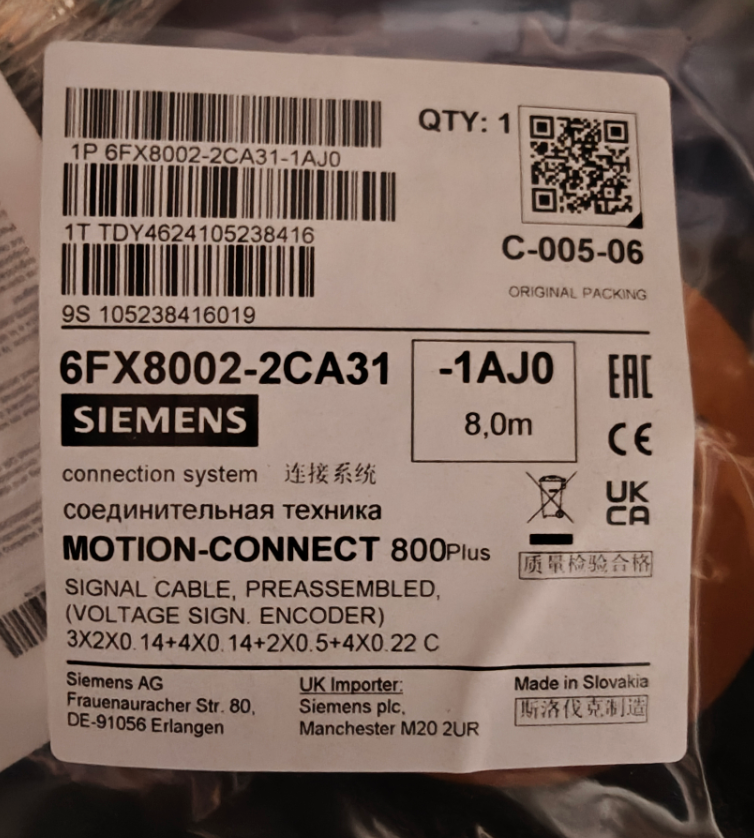 Pre-assembled signal cable for incremental encoder with C/D tracks integrated into the motor: 3x (2x0.14) C+4x 0.14+2x0.5 +4x 0.22 C Connector full thread M23 MOTION-CONNECT 800PLUS trailable UL/CSA DESINA Dmax=9.8 mm Length (m)= TYPE: 6FX8002-2CA31