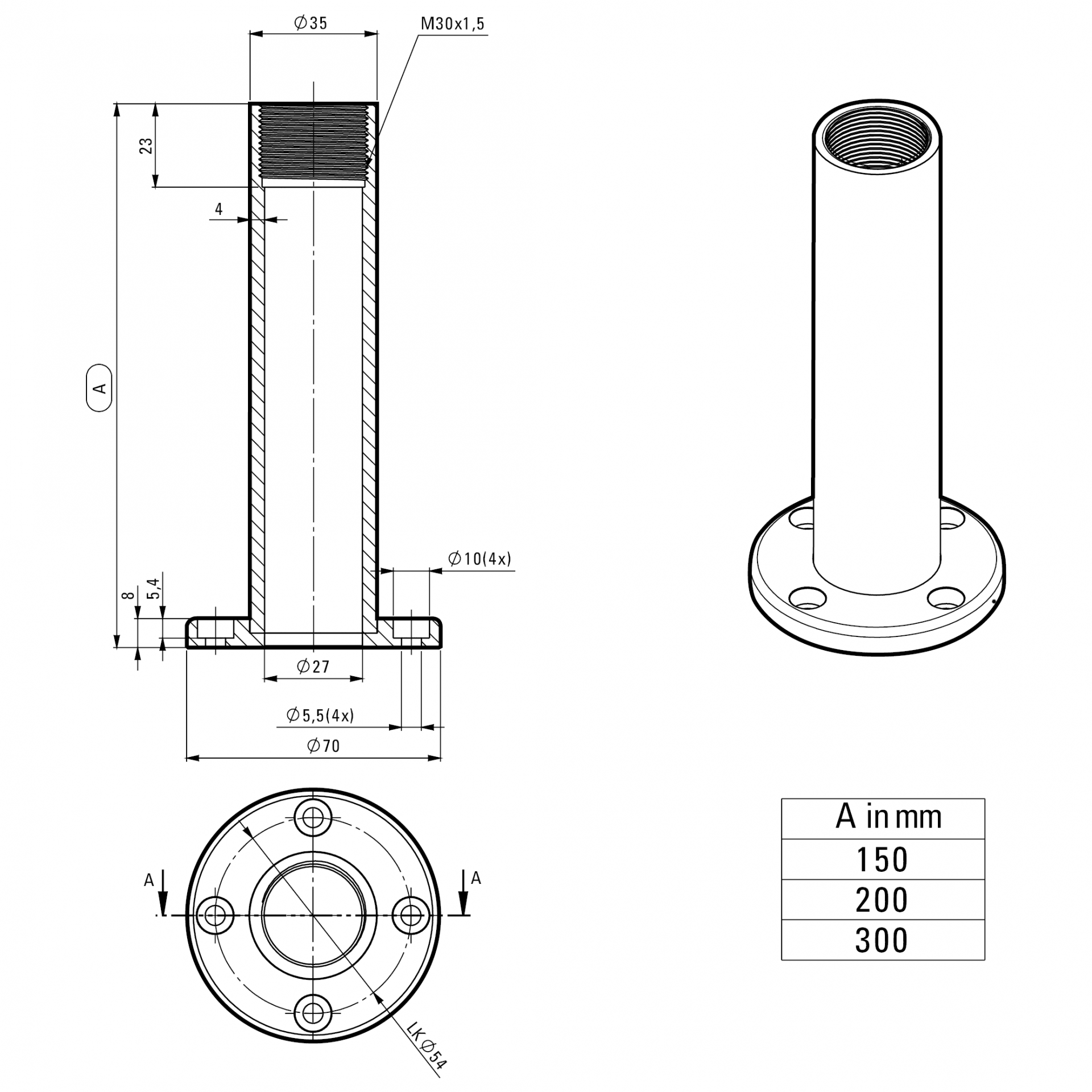 LED2WORK's monteringsrør er i pulverlakeret aluminium, Højder på 150, 200 eller 300 mm gør det muligt at montere din DOMELED sikkert og stabilt på maskiner eller andet industrielt udstyr.