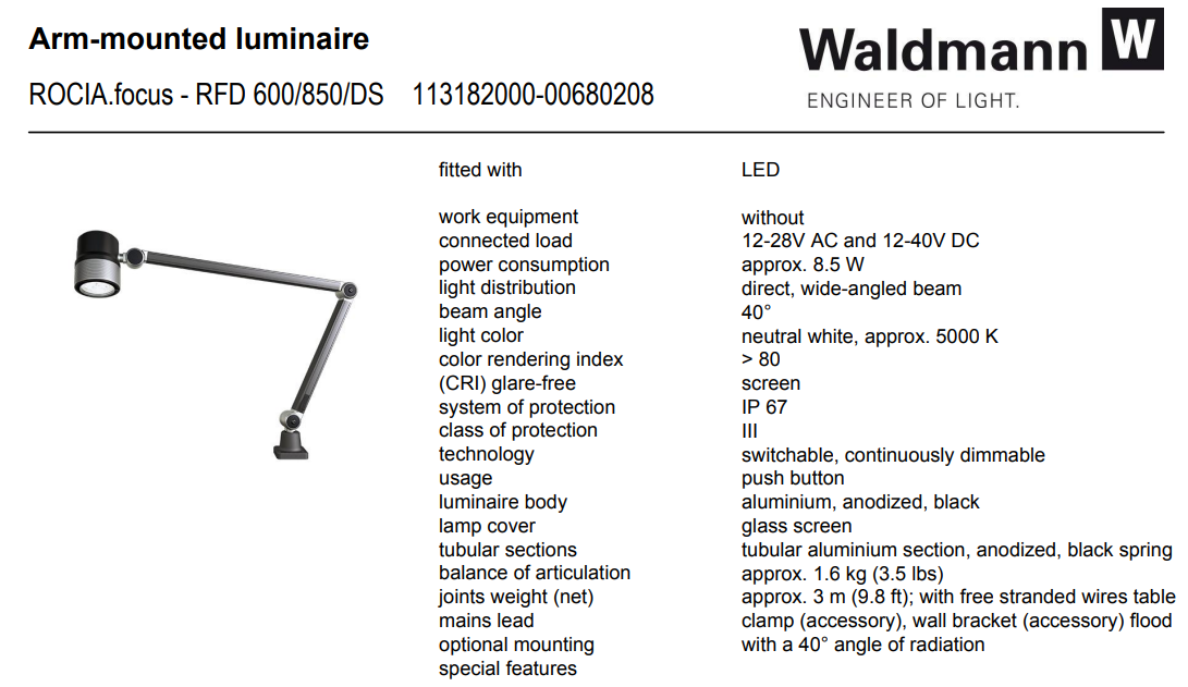 Waldmann lampe med arm - 24Vdc (RFD 600/850/DS) (113182000-00680208)